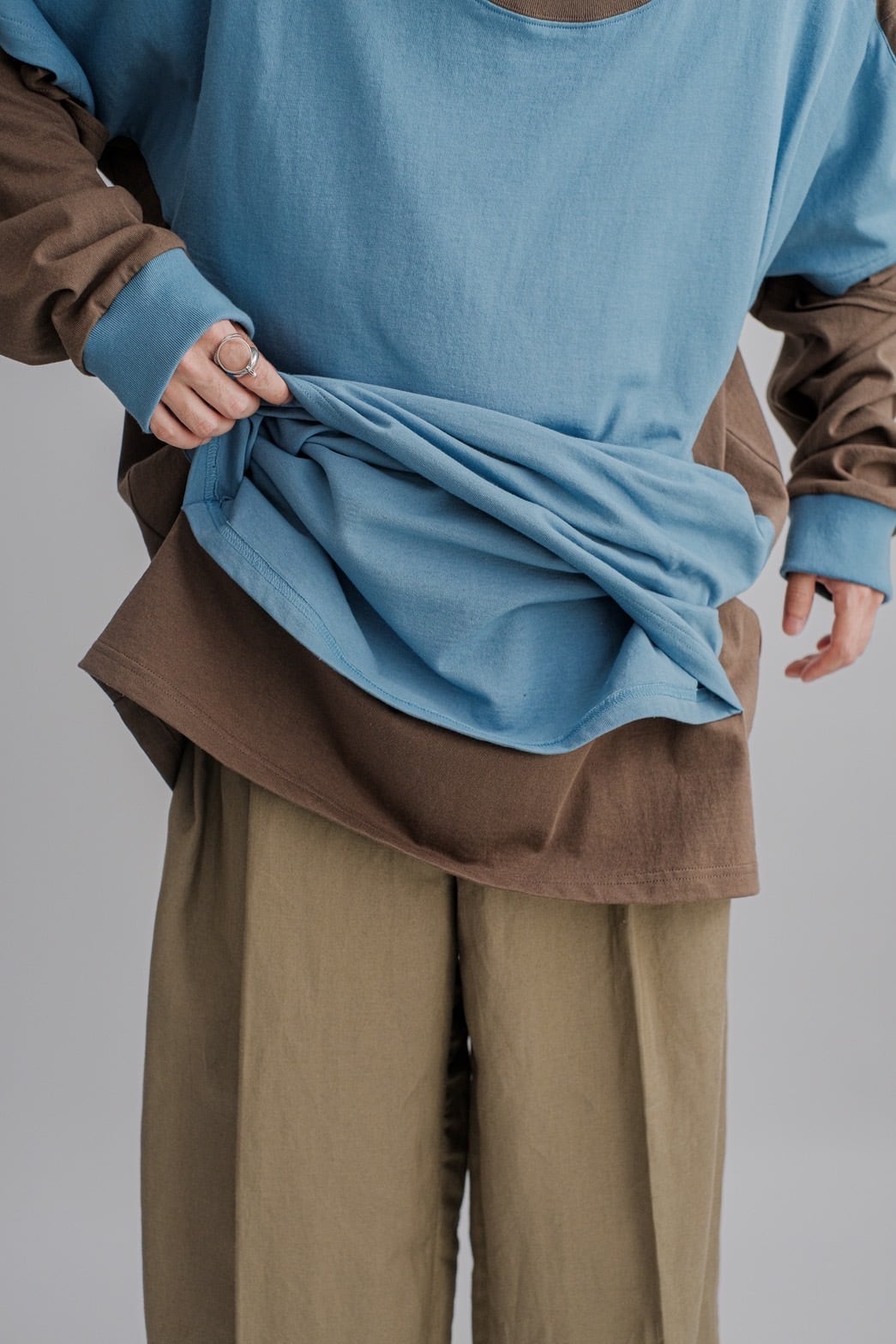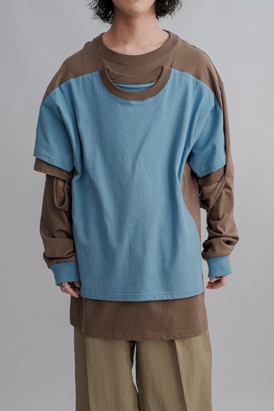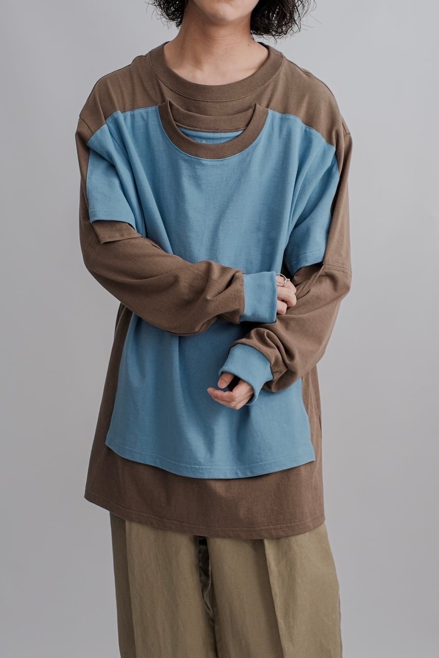 洗濯物を⼲していたときに⾵に吹かれて、⼤きなロンTにミニTがくっついたところから着想を得て作りました。