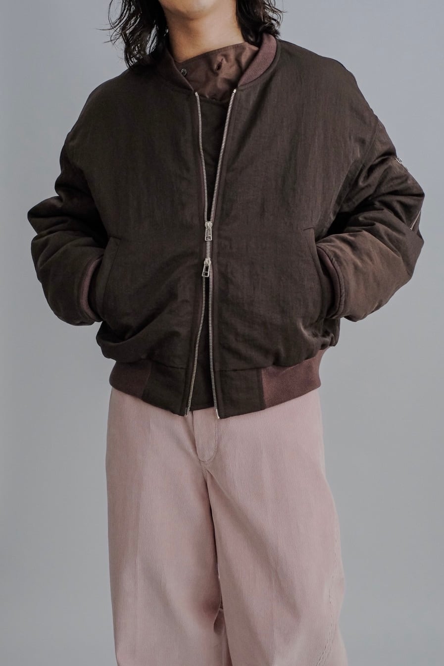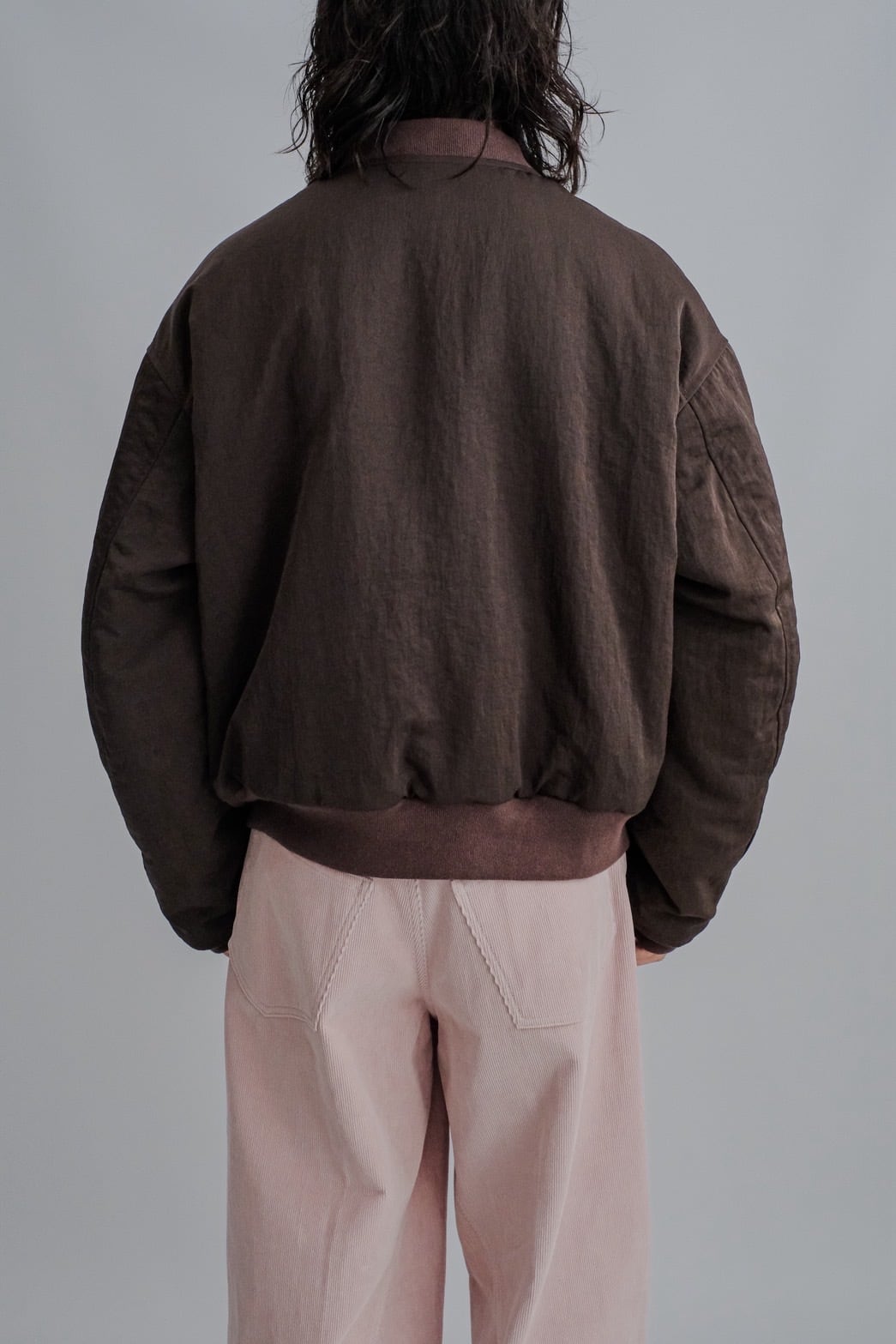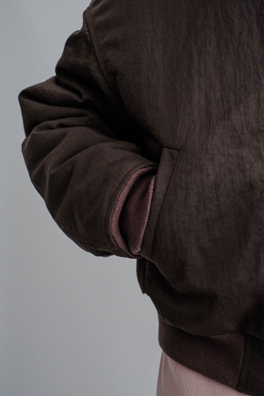 ・120g/m²のボリュームのある中綿を裏地側に抱き合わせる縫製方法を採用することにより、表側をフラットな仕上がりになるように仕上げているデザイン。