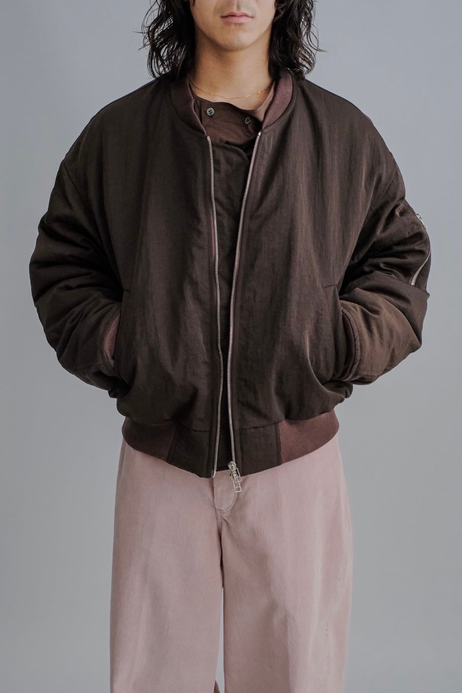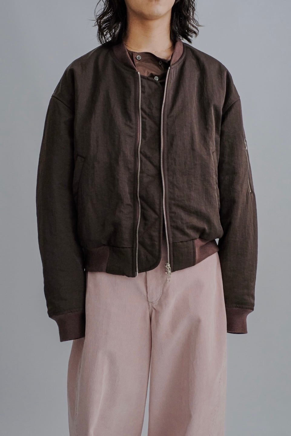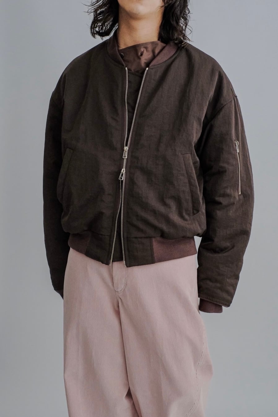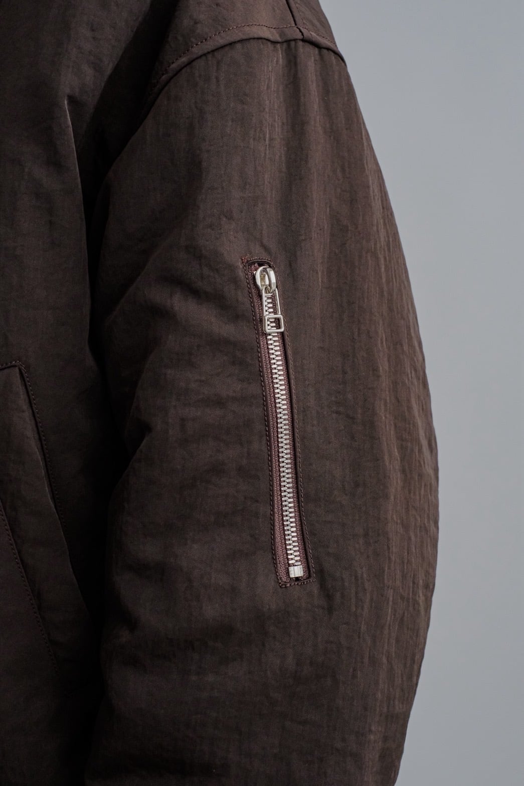 ・120g/m²のボリュームのある中綿を裏地側に抱き合わせる縫製方法を採用することにより、表側をフラットな仕上がりになるように仕上げているデザイン。